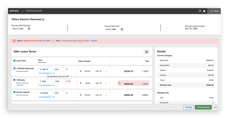 Renewals in Entrata just got a major upgrade. With a redesigned renewal offer, new renewal signaling, and enhancements to the Renewal Dashboard, it’s now easier to track resident intent, streamline renewal workflows, and improve overall retention visibility.